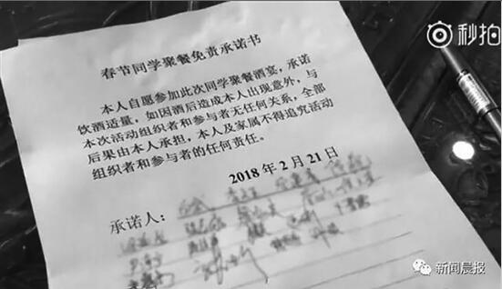 逢年过节,朋友间、同学间、同事间聚会免不了要喝酒。但近年来,一起喝酒、劝酒后引发的生命安全意外纠纷屡次见诸报端。也正因为如此,最近,网上流传聚会喝酒先签所谓的“免责承诺书”,网友更将之戏称为“生死状”。那么,签了这张“生死状”,一旦出现意外事件,同桌喝酒人真的就可以免责吗?2月26日记者采访了解到,其实云南昆明已有判例,一旦出现意外,同桌喝酒的人应当承担责任。西山区法院法官李文华提醒:酒友签订的“生死状”无法律效力,万一发生意外,同桌的劝酒人也要承担责任。
